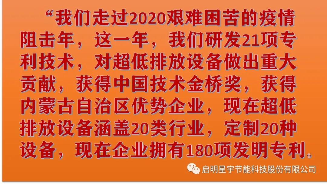 我們走過艱難困苦2020疫情阻擊年,這一年,我們研發(fā)21項專利技術(shù),對超低排放設(shè)備做出重大貢獻(xiàn),獲得中國技術(shù)金橋獎,獲得內(nèi)蒙古自治區(qū)優(yōu)勢企業(yè),現(xiàn)在超低排放設(shè)備涵蓋20類行業(yè),定制20種設(shè)備。